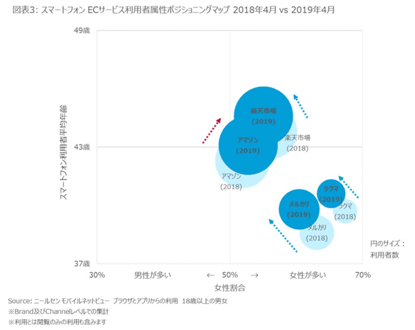 そこで、スマートフォンでECサービスを利用しているユーザーを、性別と年代別の2軸でマッピングしてその推移を見た。すると、「メルカリ」「ラクマ」の利用者は、スマートフォン利用者の平均年齢と比較して若く、女性の利用者割合が高いことが判明した。また、全体的な傾向として平均年齢が上昇していることも分かった。「楽天市場」「メルカリ」「ラクマ」では男性の割合が増え、「Amazon」のみ女性の利用者割合が増えていた。以前は性別による偏りがあったが、各サービスの利用者属性が平均化していると考えられる。