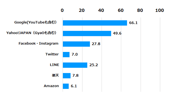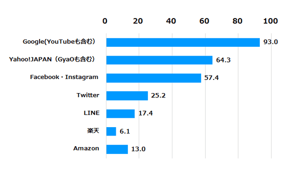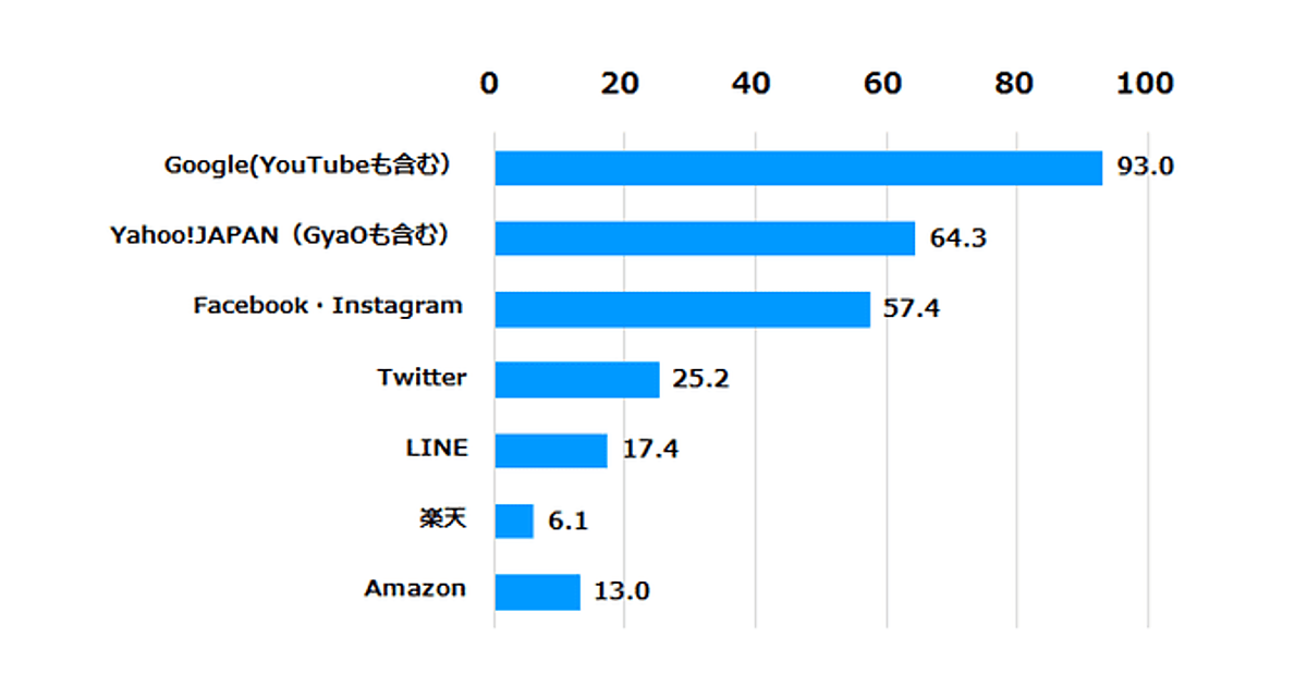 - 【調査内容】「Amazon」「Facebook(Instagram含む)」「Google(YouTube含む)」「LINE」「Twitter」「Yahoo! JAPAN(GYAO!含む)」「楽天」の7つの広告プラットフォームに対するイメージ調査