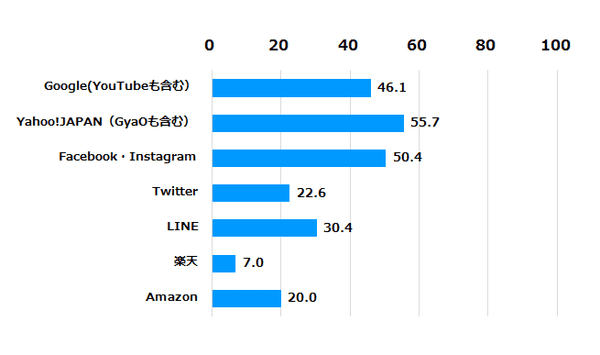 さらに、「広告の配信先としての信頼性の高さがある広告プラットフォーム」を聞くと、「Yahoo! JAPAN」55.7%が1位。以下「Facebook」50.4%、「Google」46.1%の順に入れ替わる。またここでも「LINE」30.4%、さらに「Amazon」20.0%と、評価が上がっている。