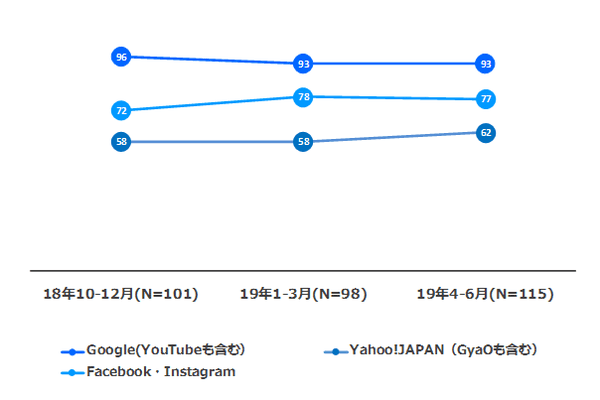 デジタルインファクトは、大手広告プラットフォーム(Amazon、Facebook、Google、LINE、Twitter、Yahoo! JAPAN、楽天の7つの広告サービス)に関する調査結果を発表した。2018年第4四半期、2019年第1四半期に続き、2019年第2四半期(4~6月期)に続く第3回目。国内デジタル広告業界関係者115名に、各プラットフォームが提供する広告サービスについて質問している。