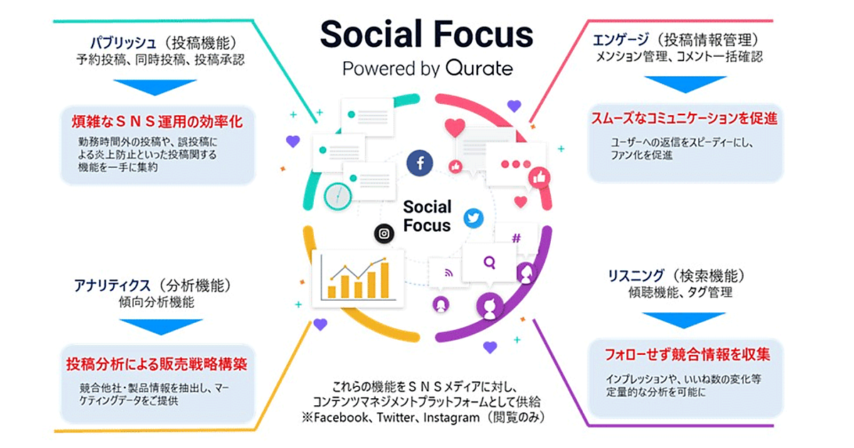Social Focusは「Facebook」「Twitter」「Instagram」に対応。パブリッシュ(投稿)、エンゲージ(管理)、アナリティクス(分析)、リスニング(傾聴)の機能がある。複数プロジェクトの発信情報の一元管理や、複数SNSの同一画面の分析、権利者による投稿管理などができ、これらによって煩雑だった管理・分析業務を効率化する。
