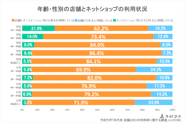 リザーブリンクが運営する「予約ラボ」は、顧客の購買行動について、「実店舗とネットショップ(EC)の利用率」「店舗を利用する商品のジャンル」の調査結果を発表した。全国の20代~60代の男女2,158人が対象。