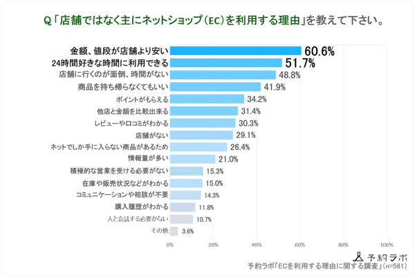 逆に“店舗でなくECを利用する理由”を聞くと、「金額、値段が店舗より安い」60.6%、「24時間好きな時間に利用できる」51.7%、「店舗に行くのが面倒、時間がない」48.8%、「商品を持ち帰らなくてもいい」41.9%などが上位となった。実店舗を利用する理由ほど大きな差はなく、各項目に数値が分散している。