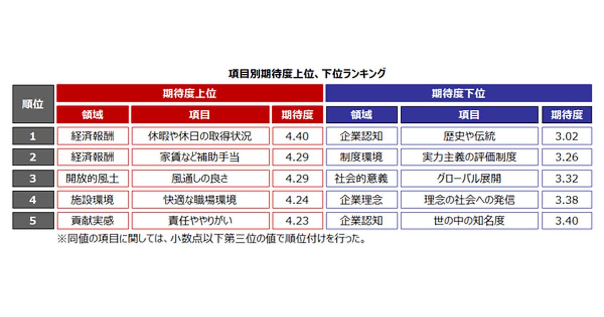 項目別でもっとも期待度が高かったのは、「経済報酬:休暇や休日の取得状況」(4.40)で、以下「経済報酬」:家賃など補助手当」(4.29)、「開放的風土:風通しの良さ」(4.29)が続く。もっとも低かったのは「企業認知:歴史や伝統」(3.02)で、以下「制度環境:実力主義の評価制度」(3.26)、「社会的意義:グローバル展開」(3.32)が続く。全体的に“待遇”“環境”などの個人的な要素が上位で、“認知”“評価”といった組織的な要素は低い。