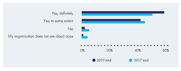まず、「組織が攻撃を受ける理由」を聞いたところ、「IoTデバイス」54%、「ウェブポータル」50%に続き、「クラウドアプリケーション」49%が、サイバー攻撃の標的になりやすくなる理由にあがった。日本だけの結果を見ると、「クラウドアプリケーション」45%が1位で、以下「ウェブポータル」43%、「モバイルアプリケーション」39%の順だった。同時にITリーダーの97%(日本:94%)が、「クラウドサービス利用を継続するためにはアクセス管理が必須である」と回答した。