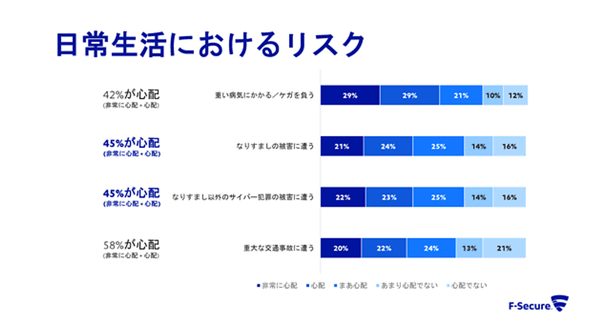 リスク意識を聞くと、「重い病気にかかる/ケガを負う」といった日常的なリスクへの心配(42%)より、「サイバー犯罪で、なりすましの被害に遭う心配」45%、「サイバー犯罪で、なりすまし以外の被害に遭う心配」45%のほうが高く、もはや、“サイバー犯罪被害は、ケガや病気より心配な事項”となっている。