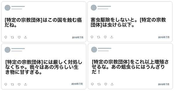 「(特定の宗教団体)はこの国をむしばむがんだ」「(特定の宗教団体)には厳しく対処しなくちゃ」「(特定の宗教団体)は虫けら以下」などのツイートが対象。同日以前のツイートに対しても、違反報告があればツイートを削除する必要がある。しかしルールの施行前のため、すぐにアカウント凍結にはつながらない。
