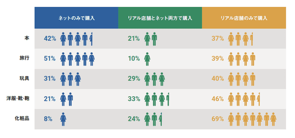 購入ルートのパターンとしては、「ネットのみで購入」「ネットとリアル店舗の両方で購入」「リアル店舗のみで購入」の3つになるが、それぞれのトップは「ネットのみで購入」は「本」42%、「ネットとリアル店舗の両方で購入」は「洋服・靴・鞄」33%、「リアル店舗のみで購入」は「化粧品」69%と、大きく異なった。