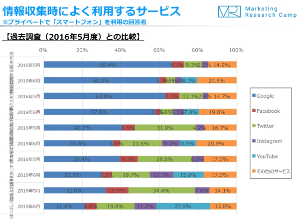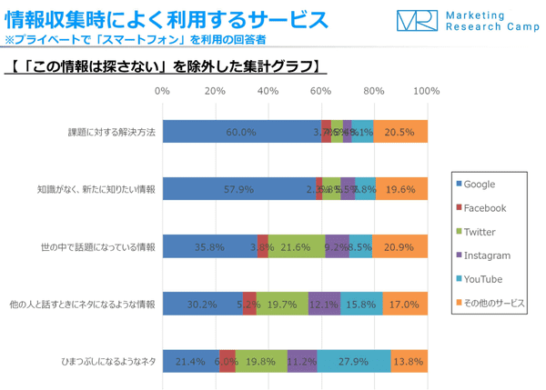 全回答者のうち、プライベートでスマートフォンを利用している回答者942人に、「情報収集時によく利用するサービス」(Google、Facebook、Twitter、Instagram、YouTube、その他。「探さない」は除外)を目的別で聞いた。