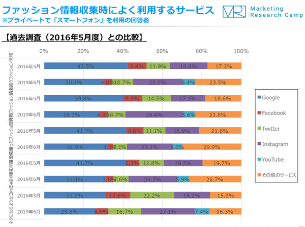2016年5月度の調査と比較すると、もともとファッション情報収集にInstagramは使われていたが、さらにその力を増していることが伺える。YouTubeやその他サービスも伸びており、アパレルなどが多角展開していることが影響している模様だ。