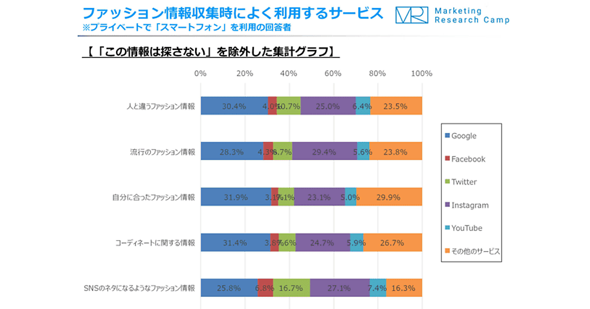 さらに、「ファッション情報収集時によく利用するサービス」を目的別に聞いた。ここではInstagramが大きく伸長し、「流行のファッション情報」29.4%、「SNSのネタになるようなファッション情報」27.1%ではGoogleを上回り1位となっている。そのほか「人と違うファッション情報」「自分に合ったファッション情報」「コーディネートに関する情報」でもGoogleに肉薄する。