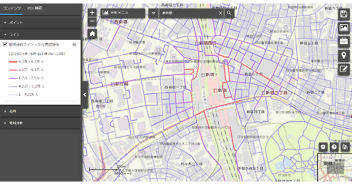 従来、各府省が公表する統計データだけでは、時系列で人流を可視化することは困難だった。今回、ブログウォッチャーのプロファイルパスポートから位置情報データを連携することにより、時系列で人流を可視化できるようになり、ESRIジャパンのmapDISCOVERYにおいて歩行者混雑度オプションサービスを利用することで道路の混雑状況や商圏分析が可能になった。