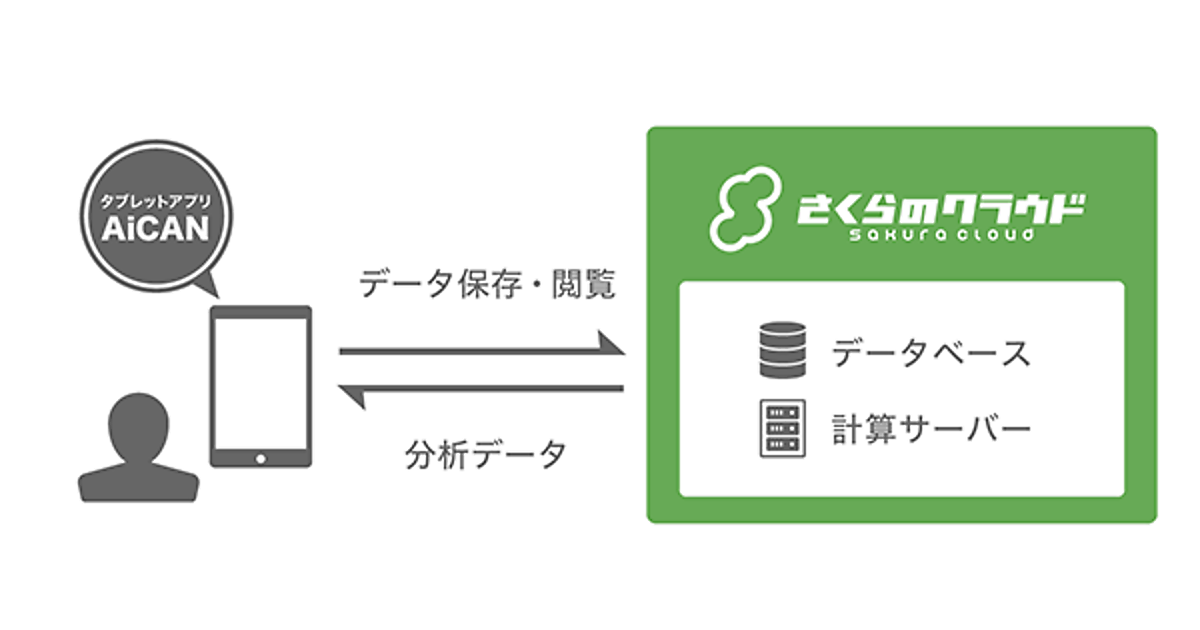 児童虐待対応支援システムは、タブレット端末用アプリ「AiCAN(Assistance of intelligence for Child Abuse and Neglect)」とクラウド上の計算サーバーおよびデータベースで構成する。さくらインターネットは、タブレット端末とクラウドをつなぐデータ通信および、同社が国内で運営するデータセンターを利用し、国内法を適用できるクラウドサーバーシステムを構築した。