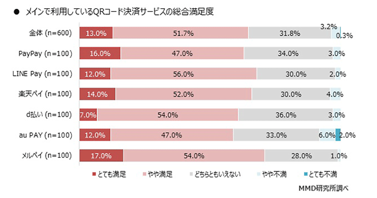 MMD研究所は、「2019年7月QRコード決済利用動向調査」において利用率が高かったQRコード決済サービスの上位6サービスの利用者18歳~69歳の男女600人※を対象に、「2019年7月 QRコード決済の満足度調査」を実施した。