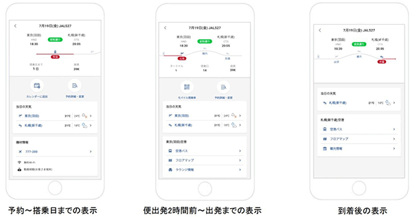 今回、リニューアルによって搭乗のための情報が一目で分かるホーム画面にした。メニューは予約状況に応じて変化し、最も近い予約内容をホーム画面に表示。JALマイレージバンク(JMB)会員情報、座席番号、ターミナル、搭乗口、運航状況などの情報が容易に確認できる。情報は、搭乗時の動きや運航状況に応じて変更される。