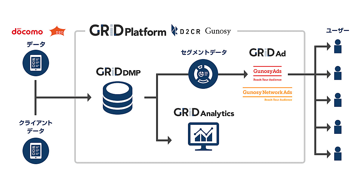 GRID Platform for docomo Adsは、携帯電話契約数国内トップのドコモが持つ会員情報などのデータを生かしたアドネットワーク。データは、顧客の同意を受けて取得した個人情報を含まない性別・年代などとなる。これと広告主企業のユーザーデータを組み合わせ、任意のユーザーセグメントに広告配信できるようになる。