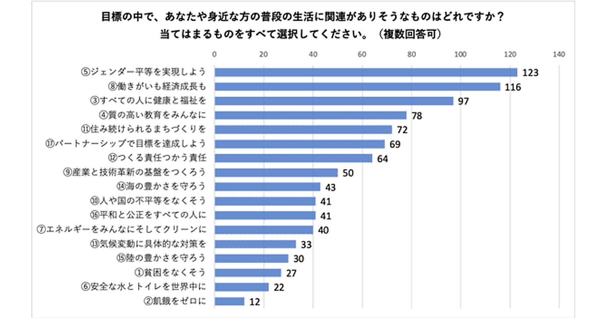 まず「SDGsに関心がある」とした回答者164人が、「普段の生活に関連がありそうなもの」と感じた目標は、「ジェンダー平等を実現しよう」123票、「働きがいも経済成長も」116票、「すべての人に健康と福祉を」97票が上位3項目となった。一方で「飢餓をゼロに」は12票で、ジェンダー平等のほぼ10分の1に留まった。