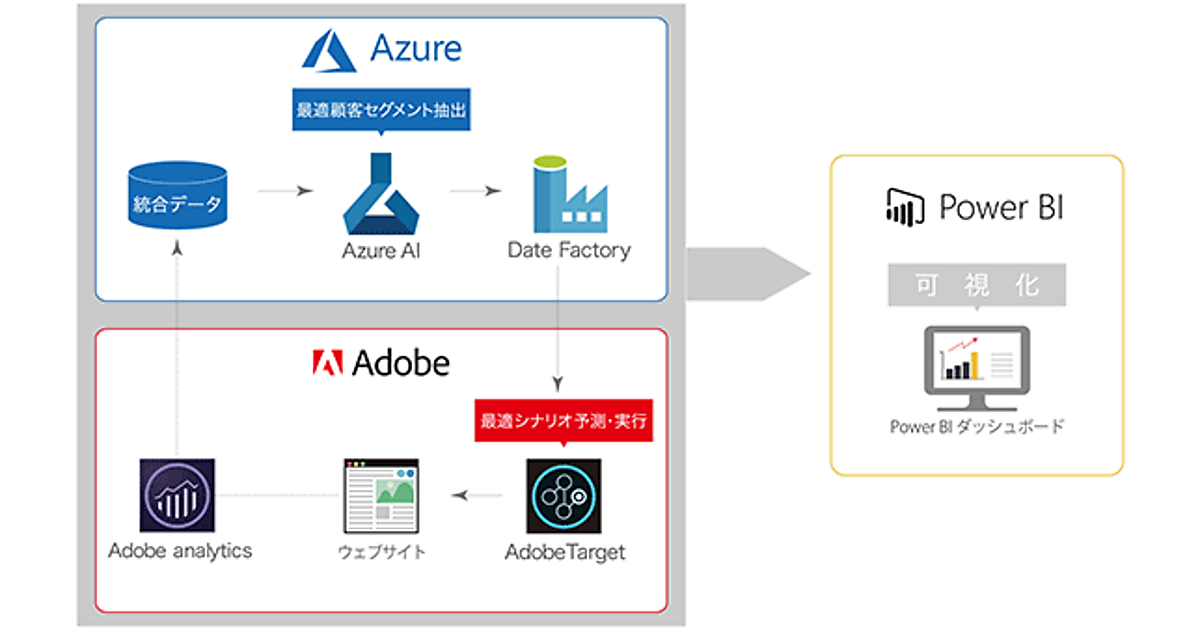そのうえで、アドビのパーソナライズソリューション「Adobe Target Premium」のAIと機械学習の技術「Adobe Sensei」を活用した自動パーソナライズ機能に連携。最も購入につながりやすいシナリオを予測・実行する。分析・実行の状況は可視化し、マイクロソフトのビジネス分析ソリューション「Power BI」との連携で一元管理可能にする。