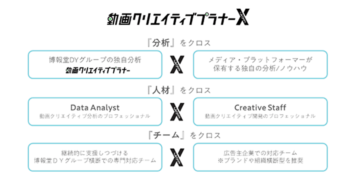 両社が開発した動画広告最適化支援ソリューション「動画クリエイティブプラナー」の進化版となる。動画クリエイティブプラナーで得られた分析結果に、メディアやプラットフォーマーが持つ独自の分析手法や知見を加えると同時に、クリエイティブスタッフとも協働。1つのチームで分析からプラニング、運用まで実施する。