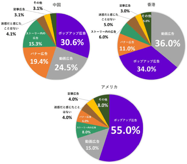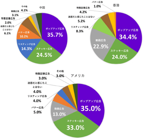 逆に「SNS広告で迷惑だと感じる広告」を聞くと、3つの国・地域共通で「動画広告」「ポップアップ広告」が1位・2位となり、合計は50%を超えた。アメリカは、「ポップアップ広告」単独で55%となっている一方、YouTube人気を反映し「動画広告」の数値は低めだ。