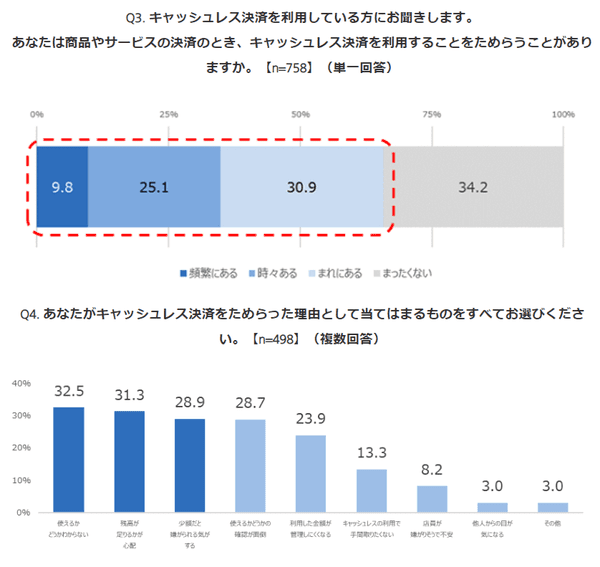 しかし、キャッシュレス決済をすでに利用している758人に対して、「利用をためらった経験があるか」と聞くと、65.8%が「ある」と回答。理由としては「使えるかどうかわからない」32.5%、「残高が足りるかが心配」31.3%、「少額だと嫌がられる気がする」28.9%が上位となり、“システムや使いこなしへの不安・不信”が思った以上に強いことがわかる。