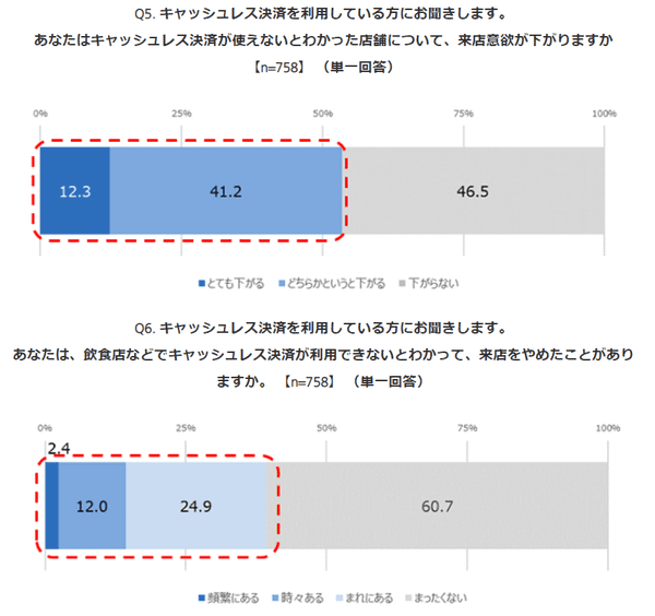 キャッシュレス決済をすでに利用している758人に「キャッシュレス決済が使えないとわかった店舗について、来店意欲が下がるか」を聞くと、53.5%が「下がる」と回答。「来店を取りやめた経験が実際にあるか」を聞くと、39.3%が「ある」と回答した。“利用に不安は感じるが、実際に利用できないとわかると来店意欲は下がる”という、消費者のワガママな願望が感じられる結果となった。