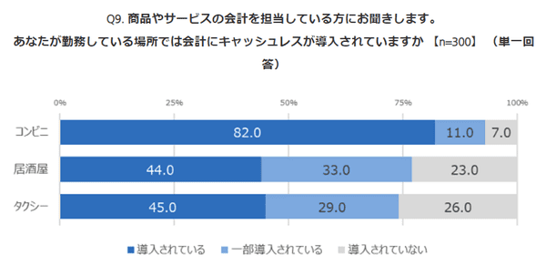 こうした一般消費者の感覚に対して、支払先である事業者はどう感じているのか? コンビニエンスストア/居酒屋/タクシーで会計業務を行っている事業者にも調査を実施。キャッシュレス決済の導入状況は、コンビニエンスストアが93.0%、居酒屋が77.0%、タクシーが74.0%が何らかのキャッシュレス決済を導入済みだった。