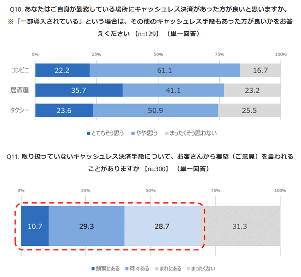 未導入の事業者(「一部導入されている」「導入されていない」と答えた129人)に「キャッシュレス決済の必要性」を聞くと、「キャッシュレス決済があったほうがいい」という回答は、コンビニ83.3%、居酒屋76.8%、タクシー74.5%となった。また、「会計業務を行っている際、一般消費者から取り扱っていないキャッシュレス決済手段について要望を言われることがあるか」を聞くと、68.7%が「要望を受けたことがある」と回答している。