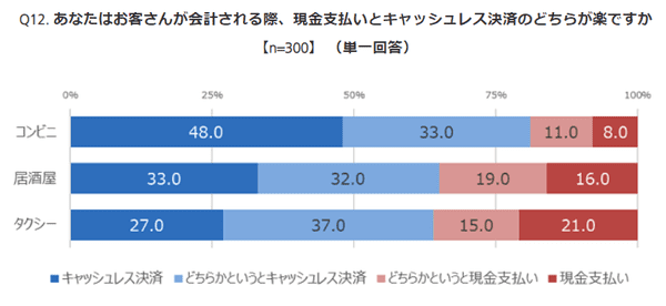 また全体(300人)に「お客さんの会計時に、現金支払いとキャッシュレス決済のどちらが楽か」と聞くと、「キャッシュレス決済のほうが楽」という回答は、コンビニ81.0%、居酒屋65.0%、タクシー64.0%だった。