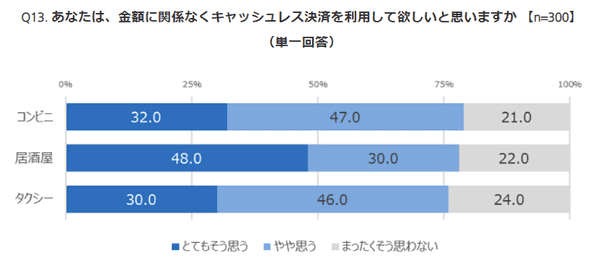 さらに「金額に関係なくキャッシュレス決済を利用してほしいか」を聞くと、コンビニ79.0%、居酒屋78.0%、タクシー76.0%が「利用して欲しい」と回答。一般消費者側が「少額だと嫌がられる気がする」とためらっている一方で、事業者側の約8割は「金額に関係なくキャッシュレス決済を利用してほしい」と思っており、すれ違いが発生していることが判明した。
