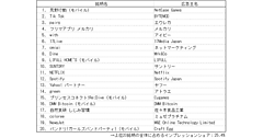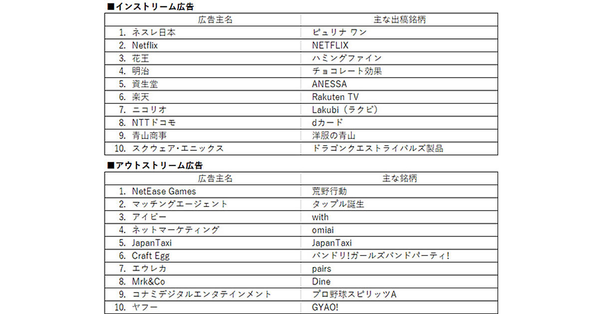 インストリーム広告では、食料品や洗剤、化粧品といった消費財メーカーが目立つ。一方アウトストリーム広告は、ゲームやマッチングサービスがほとんどすべてを占めるなか、JapanTaxiが上位にランクインした。