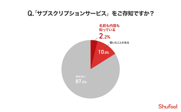 まず「サブスクリプションサービスを知っているか」を聞くと、「名前も内容も知っている」と答えたの2.2%。「聞いたことがある」も10%にとどまり、残り87.0%は「知らない」と回答している。主婦にとってサブスクリプションサービスは、まだまだ未知の存在というのが正直なところだろう。