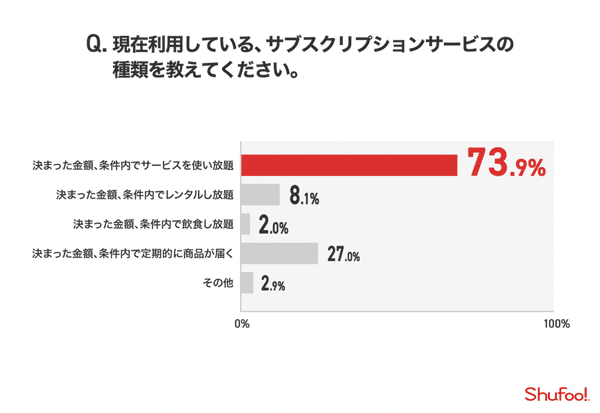 続いて、サブスクリプションサービスを「利用している」と答えた2.2%に、「利用しているサービスの形式」を聞いた。もっとも多いのは、コンテンツの利用や視聴など「サービスを使い放題タイプ」73.9%が断トツのトップ。続いて、食品やファッション、コスメなどが対象の「定期的に商品が届くタイプ」が27.0%だった。「レンタルし放題タイプ」8.1%、「飲食し放題タイプ」2.0%も少数ながら存在した。