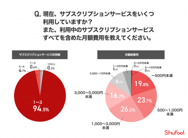 また、「利用しているサービス数」と「月額の総費用」を聞くと、利用数は「1~3」94.5%、月額総費用は「1,000~3,000円未満」26.2%が最多で、月額5,000円以下に85.9%が収まっている。
