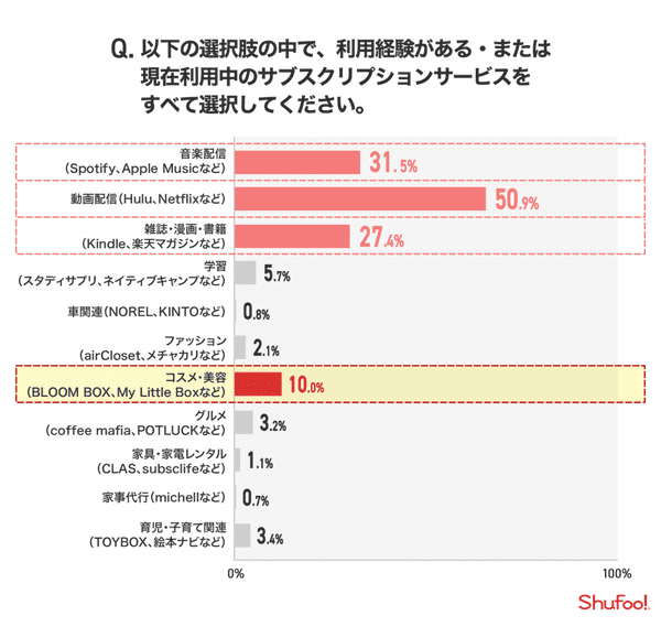 そして第4位に、さまざまなコスメや美容関連商品が入ったボックスが毎月自宅に届く、BLOCOM、BOX、My Little Boxなどの「コスメ・美容」系サブスクリプションサービスが10%でラインインした。「育児・子育て関連」3.4%、「家具・家電レンタル」1.1%、「家事代行」0.7%は低調だが、「サービス自体の認知度がまだ低いことが大きな要因」と調査では指摘している。
