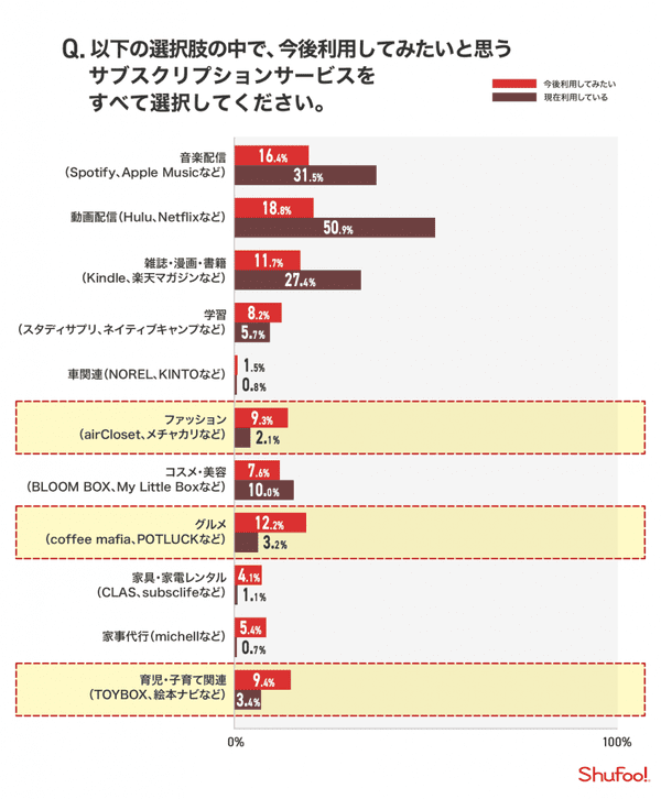 全員を対象に「今後利用してみたいと思うサブスクリプションサービス」について聞いたところ、「動画配信」18.8%、「音楽配信」16.4%に次いで、Coffee Mafia(コーヒー飲み放題)やPOTLUCK(ランチテイクアウト)の「グルメ」が12.2%で3位にランクインした。ラーメン食べ放題やランチ食べ放題など、ユニークなサービスが増加したことで主婦層からも注目を集めている模様。「ファッション」「育児・子育て関連」も今後の利用意向は高い。