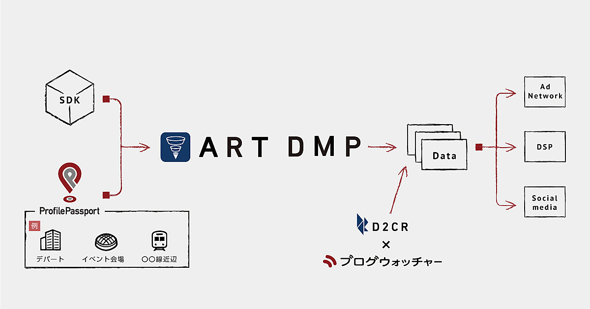 インターネット広告事業のD2C Rと、位置情報関連サービス開発・提供のブログウォッチャーは、D2C Rのスマートフォン向け広告効果測定データ基盤「ART DMP(アートディエムピー)」と、ブログウォッチャーの位置情報データプラットフォーム「プロファイルパスポート」を活用した広告配信を始めた、と8月8日発表した。