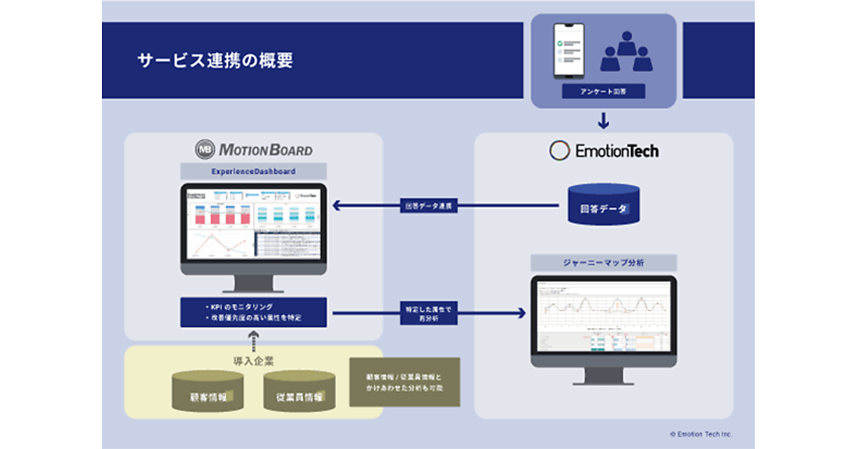 ExperienceDashboardでは、Emotion Techの提供する顧客ロイヤルティ分析システム「Emotion Tech」に蓄積するデータをウイングアーク1stのBIツール「MotionBoard」に連携し、ユーザー企業に「顧客セグメントを絞り込んでNPSや重要KPIの推移を確認できるようにする」「複数のアンケートデータを一画面で確認できるようになる」などの利便性を提供する。