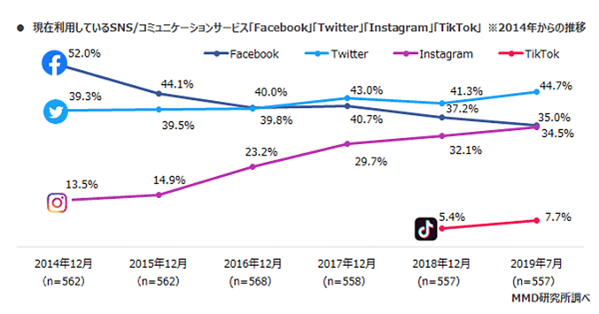 スマートフォンを所有する20歳~69歳の男女557人を対象(以下同じ)に、Facebook、Twitter、Instagram、TikTokの利用について聞いたところ、「現在利用している」という回答はFacebookが35.0%、Twitterが44.7%、Instagramが34.5%、TikTokが7.7%となった。Instagramは2014年時点での利用が13.5%だったのに対し、2019年では34.5%と5年で21ポイント増加している。