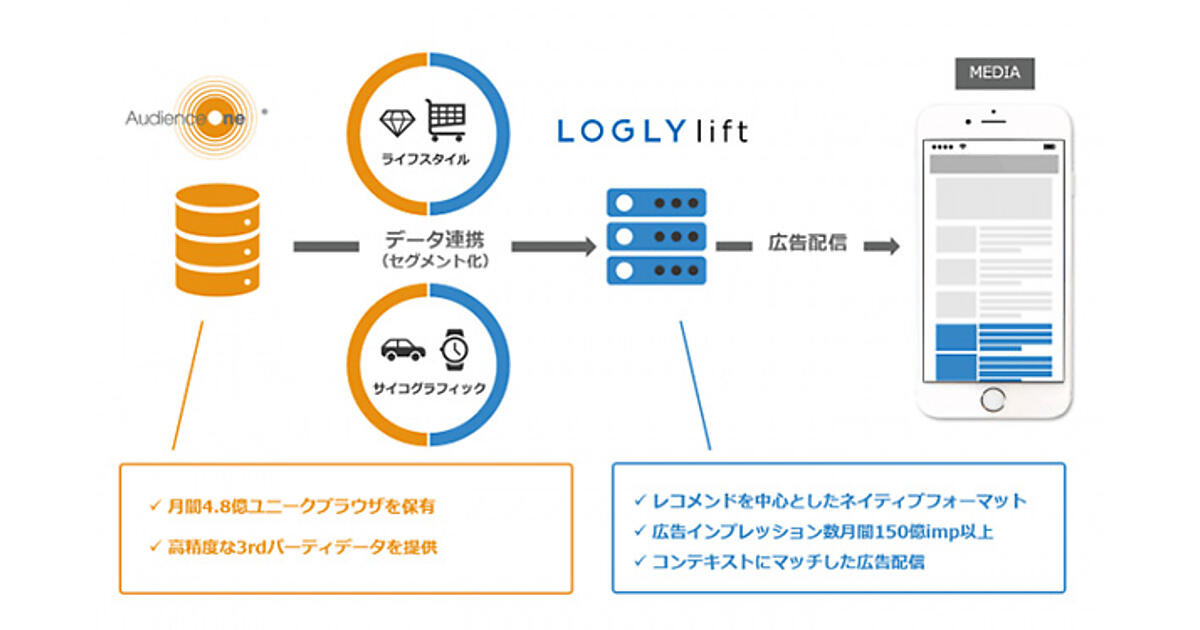 LOGLY liftは、AudienceOneのオーディエンス(広告の受け手)データと連携することで、興味・関心に合うターゲットユーザーに対して最適な広告が配信できるようになり、ユーザーとの適切なコミュニケーションを実現する。AudienceOnを使用している企業は、過去に利用したターゲットに向けてLOGLY lift上で広告配信が可能。