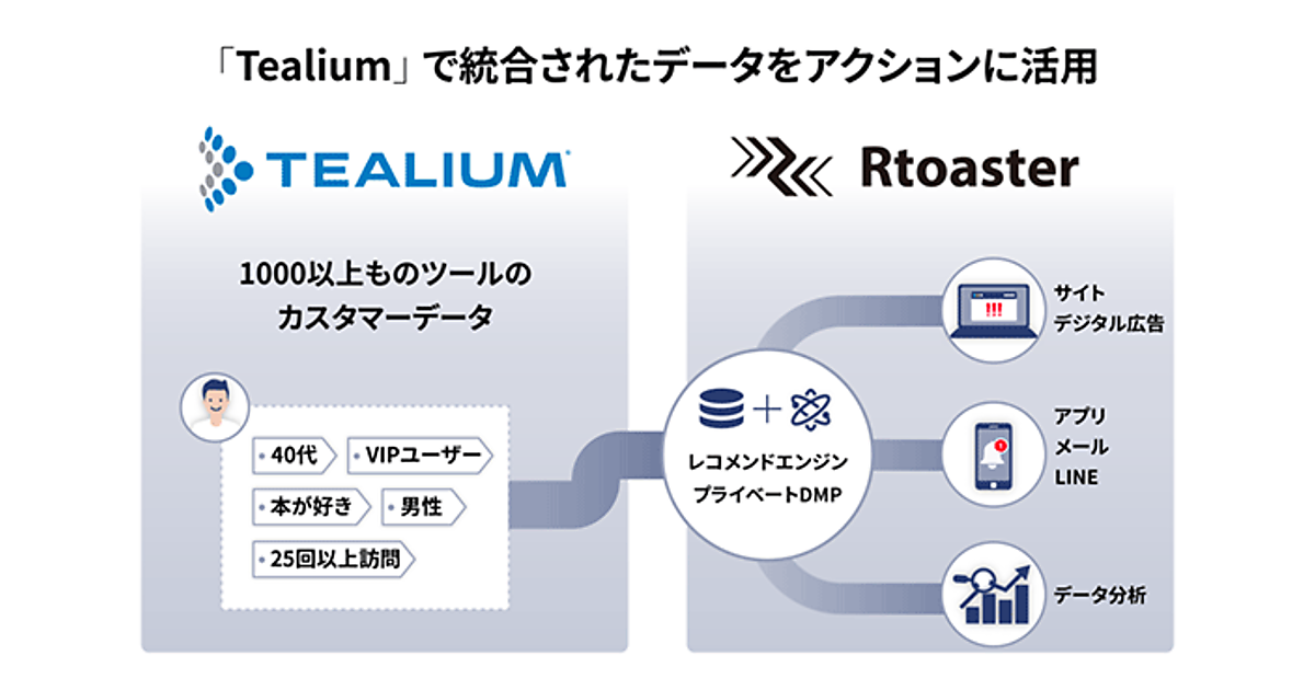 Tealium Universal Data Hubは、散在する顧客データをリアルタイムに整理・統合・連携することで、顧客プロファイルが高度化できるソリューション。連携でRtoasterは、Tealium Universal Data Hubが複数のツールで収集してリアルタイムに統合した顧客データを活用し、さまざまな行動に即時につなげられるようになる。