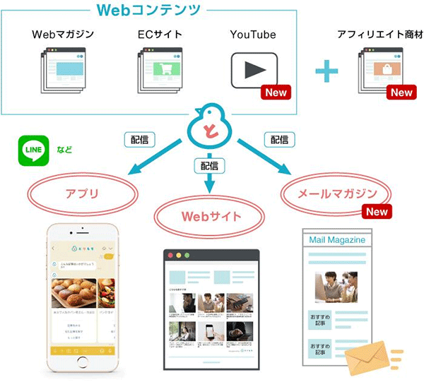 今回の機能強化によって、HTMLメールにも商品の関連コンテンツの配信を可能にしたほか、自社の「YouTube」チャンネル内の動画や、アフィリエイト商材のリンクも、関連コンテンツとしてウェブサイトやアプリなどに配信できるようにした。これによって、YouTubeコンテンツやアフィリエイト商材への送客にも有効になる。