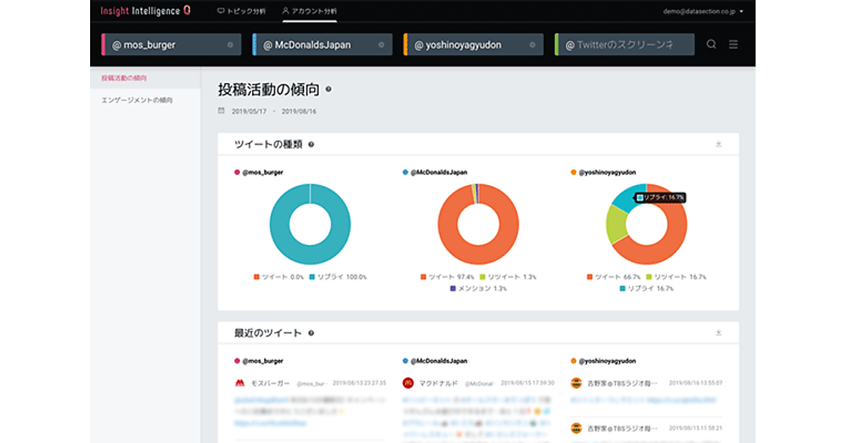 マーケティングリサーチ事業のデータセクションは、「競合Twitterアカウント分析ツール」の提供を始めた、と8月28日発表した。競合するアカウントのパターンを分析し、施策に活用できる。 同社が展開するソーシャルリスニングツール「Insight Intelligence Q(インサイトインテリジェンスキュー)」の機能となる