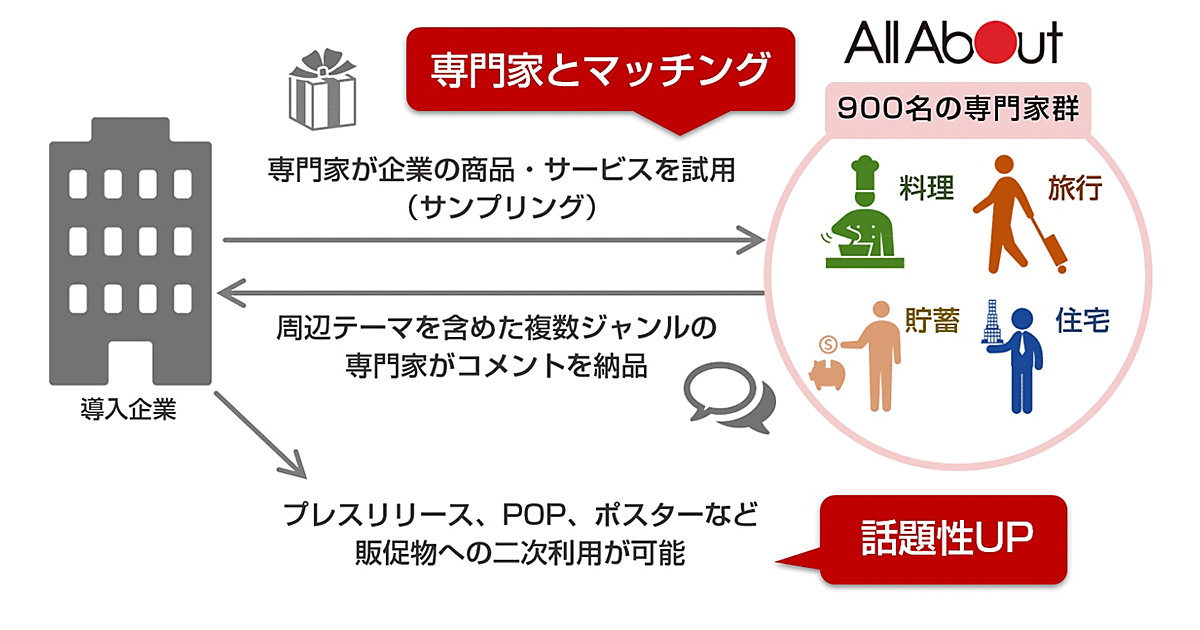 企業の広報・マーケティング活動で商品・サービスと関連のある専門家やオピニオンリーダーの視点を交えた情報発信を行う企業が増えている一方、多くの専門家やオピニオンリーダーは個人で活動していることが多く、アプローチが容易でないことから、ガイドPRを展開する。All Aboutガイドの新たな活躍機会も創出する。