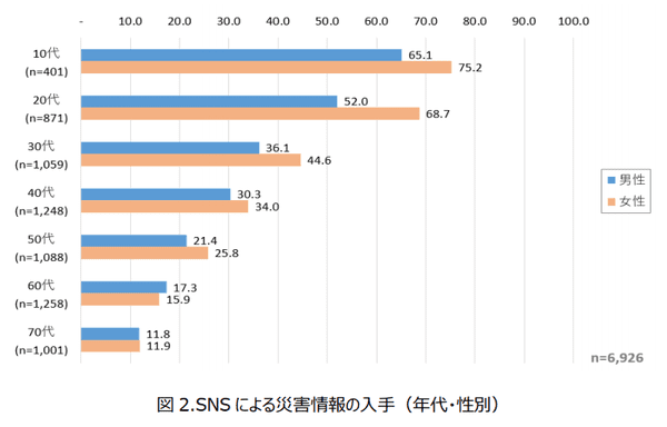 一方、「SNS」(Twitter、Facebook、Instagram、LINEなど)による災害情報の入手について聞くと、年代におけるテレビでの傾向が逆転。10代・20代は過半数が、災害時の情報入手にSNSを活用していたが、30代になると、4割前後に大きく減少。以降、年齢があがるほど利用は減少し、60代・70代は2割にも満たない。ただし性別で見ると、ここでも男性より女性のほうが、積極的に情報を入手している。