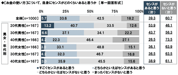 全体的な傾向を見ると、どの項目でも「センスがない」と感じている人のほうが、「センスがある」という人を上回っている。また20代・30代・40代の年代別で見ると、女性はあまり差が目立たないが、男性はいずれの質問でも、若い層ほど「センスがある」と回答している。とくに20代男性は、過半数が「お金の貯め方」「お金の使い方」「お金の管理の仕方」に“自分はセンスがある”と回答しており、全体の傾向と逆転している。