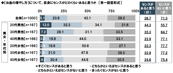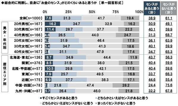調査では、「お金の貯め方」「お金の使い方」「お金の増やし方」「お金の管理の仕方」の4項目における“センスの有無”を、「すごくセンスがあると思う」「どちらかといえばセンスがあると思う」(=センスがある)、「どちらかといえばセンスがないと思う」「まったくセンスがないと思う」(=センスがない)の4段階で質問した。