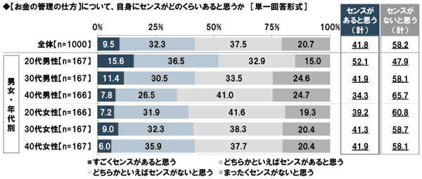 「お金の増やし方」について、「センスがある」とした人は、全体の28.7%。他項目は自信たっぷりの「20代男性」も44.3%に留まり、半数を切った。また女性の数値がとくに低く、40代男性(77.1%)を下回っている。そして「お金の管理の仕方」については、41.8%が「センスがある」があると回答。4つの項目のなかではもっとも高い数値を示した。