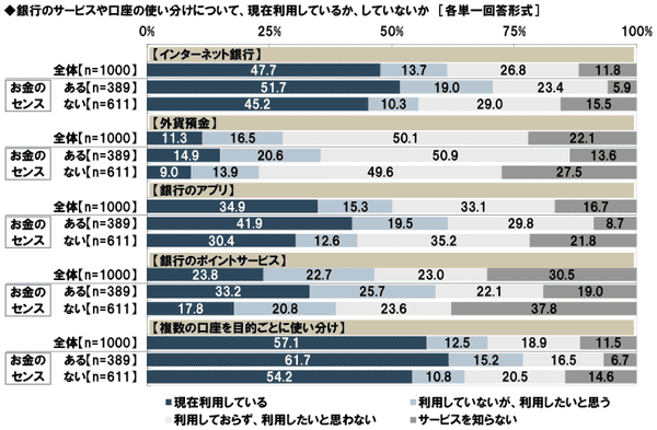 次に、「インターネット銀行」「外貨預金」「銀行のアプリ」「銀行のポイントサービス」「複数の口座を目的ごとに使い分け」といった、銀行サービスの利用状況を聞いた。