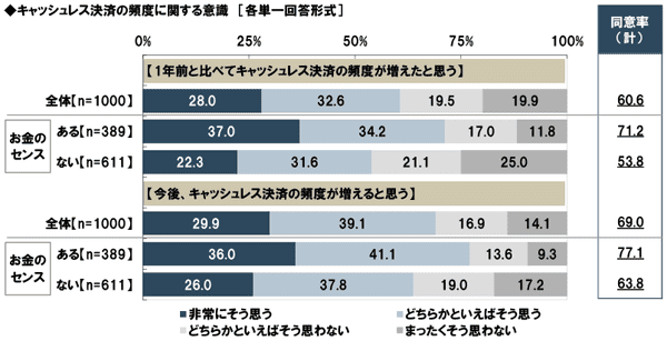 キャッシュレス決済の頻度や意識、将来予想を聞くと、「1年前と比べてキャッシュレス決済の頻度が増えたと思う」としたのは60.6%、「今後、キャッシュレス決済の頻度が増えると思う」は69.0%だった。「お金のセンス」の有無別に見ると、ここでも「センスがある」とした人のほうが、利用頻度が高い。